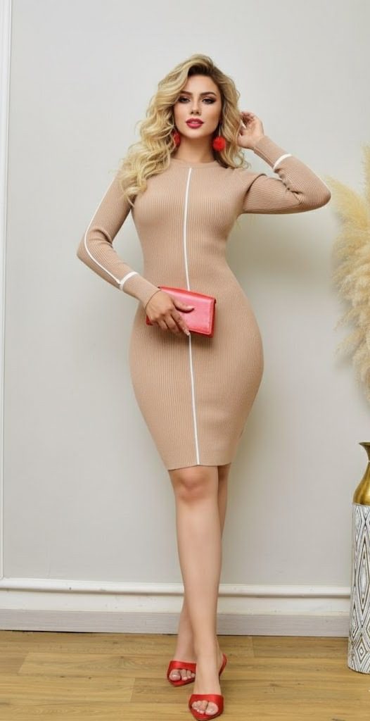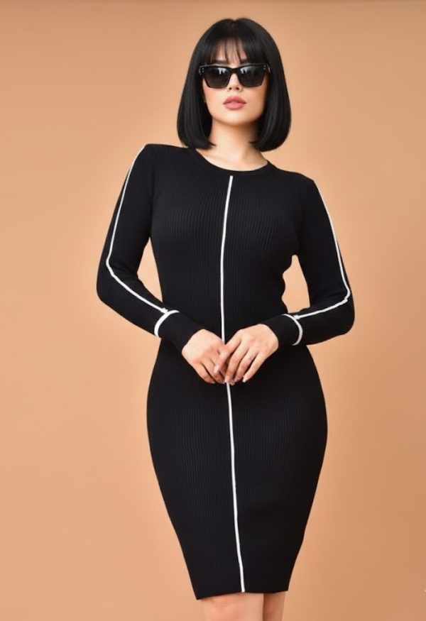 Vestido de punto canalé, manga larga. Corte ajustado tipo lápiz que estiliza la silueta. Detalle de línea vertical contrastante al frente y en manga y puños. Corte midi, cómodo y elegante. ✨ Ideal para un look moderno y versátil. 🥰