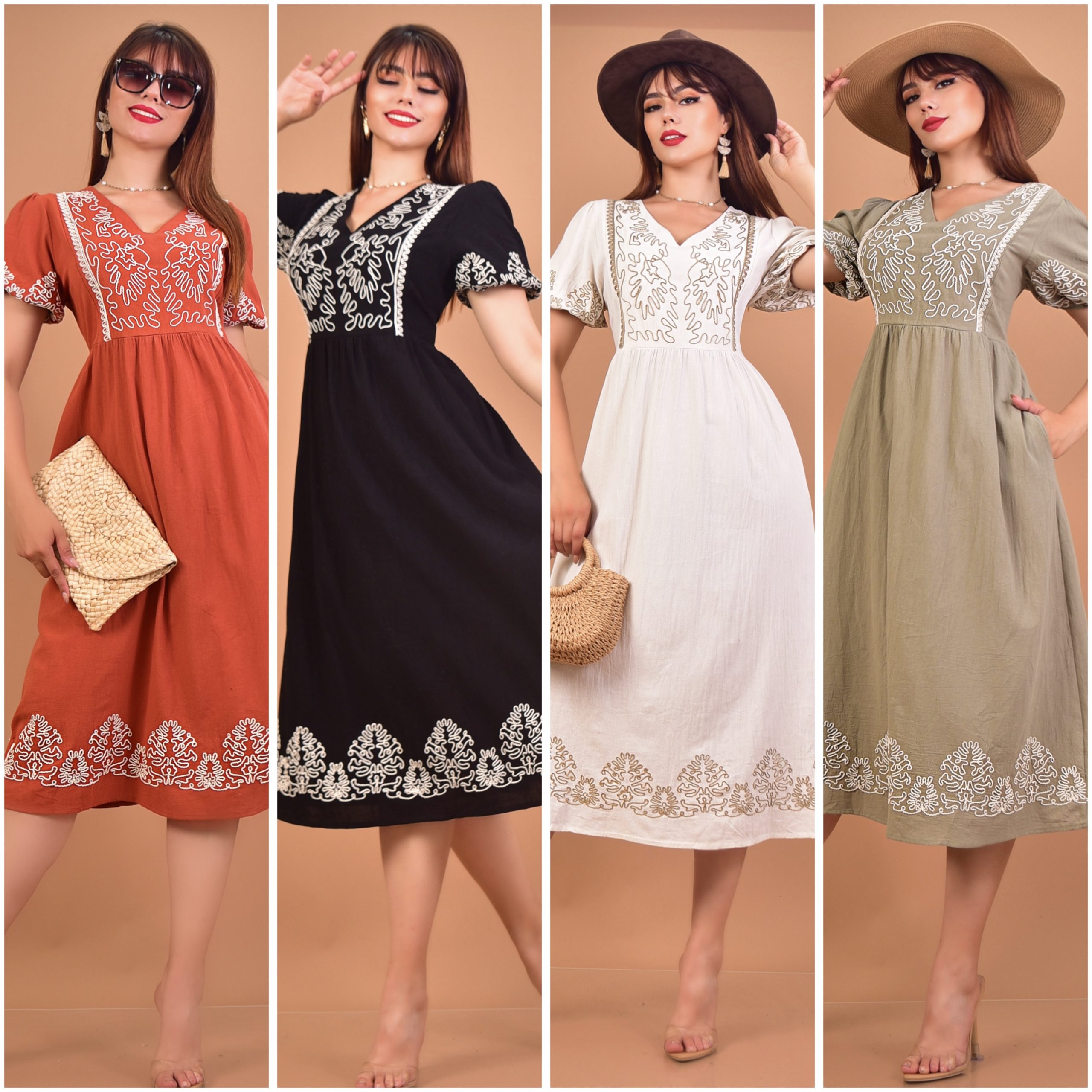 Vestido midi con silueta holgada y corte en A, ideal para un look fresco. Escote en “V”, que estiliza el cuello. Mangas cortas tipo globo con elástico en el borde. Detalles artesanales bordados en el pecho, mangas y parte baja del vestido. Bolsillos laterales. No estira.