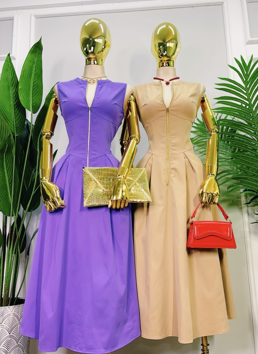 Elegante y versátil. Vestido sin mangas con corte favorecedor en la cintura. Cierre metálico frontal que le da un toque moderno. Largo midi con vuelo para una silueta femenina y cómoda. Bolsillos laterales. Tela rígida sin stretch. Un vestido práctico, fresco y chic que no puede faltar en tu guardarropa. ✨