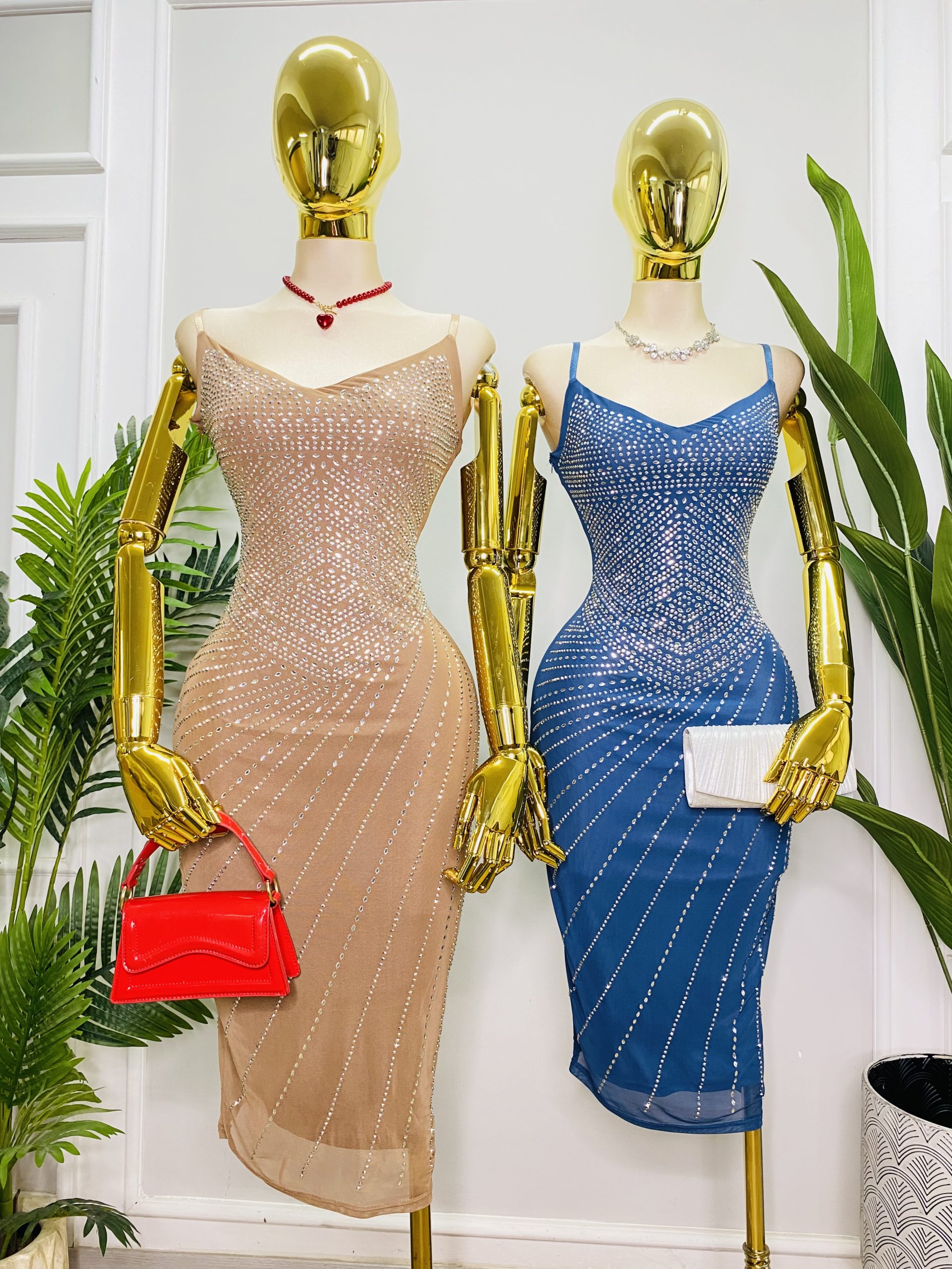 Vestido entallado confeccionado en tela tipo malla con stretch cubierta con aplicaciones de pedrería en patrón geométrico, que estilizan y resaltan la figura. Tirantes delgados y ajustables. Cierre lateral invisible. Forro interno suave. Escote corazón para un toque femenino y elegante. Corte tipo bodycon con tela stretch que se adapta perfectamente al cuerpo. Largo midi, ideal para eventos de noche o fiestas especiales. Un vestido que roba miradas y resalta tus curvas con sofisticación