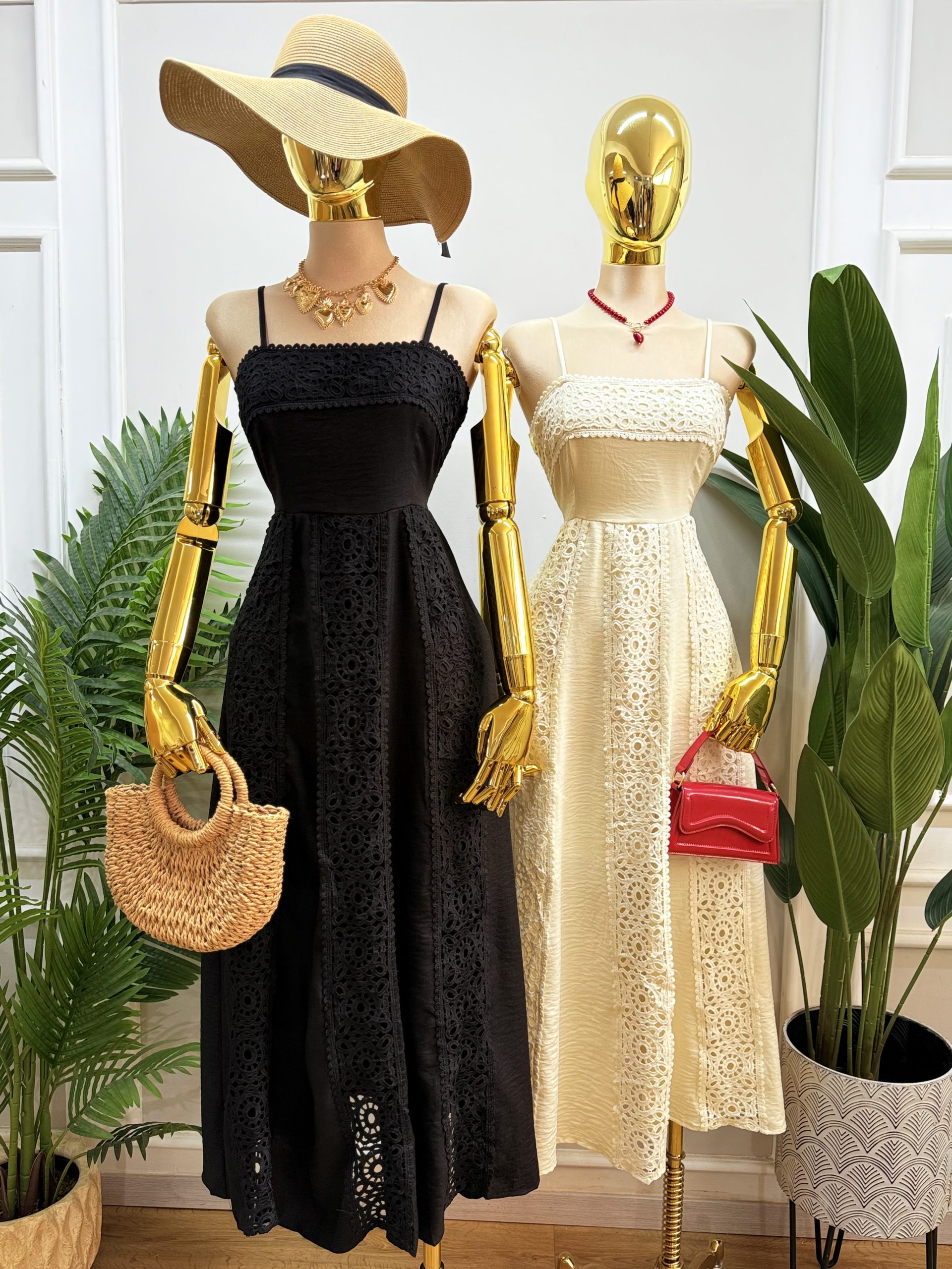 Elegante vestido midi con tirantes delgados ajustables y elástico en la espalda. Escote cuadrado con detalles de encaje, lo que le da un toque romántico y femenino. Falda con paneles de encaje calado floral, forro. Ligero y fresco, corte evasé. Tela de algodón.