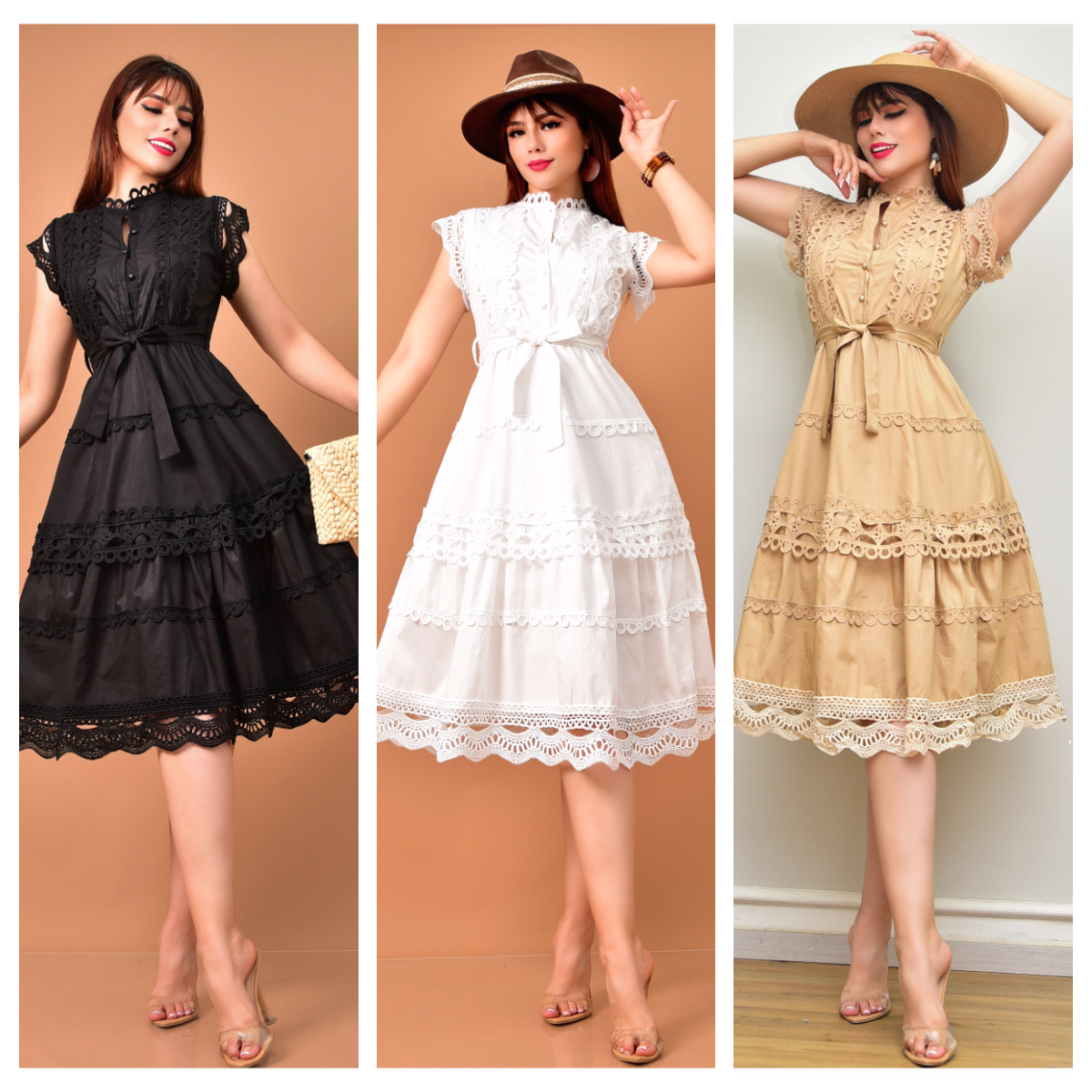 Elegante vestido midi ideal para lucir fresca, femenina y sofisticada. Confeccionado en tela 100% de algodón y detalles de encaje bordado, destaca por su diseño romántico y bohemio.