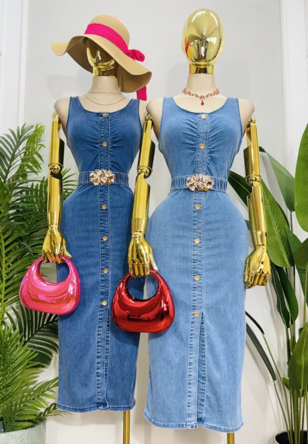 ☀️🌺 VESTIDO MIDI DE DENIM CON CINTURON ELÁSTICO