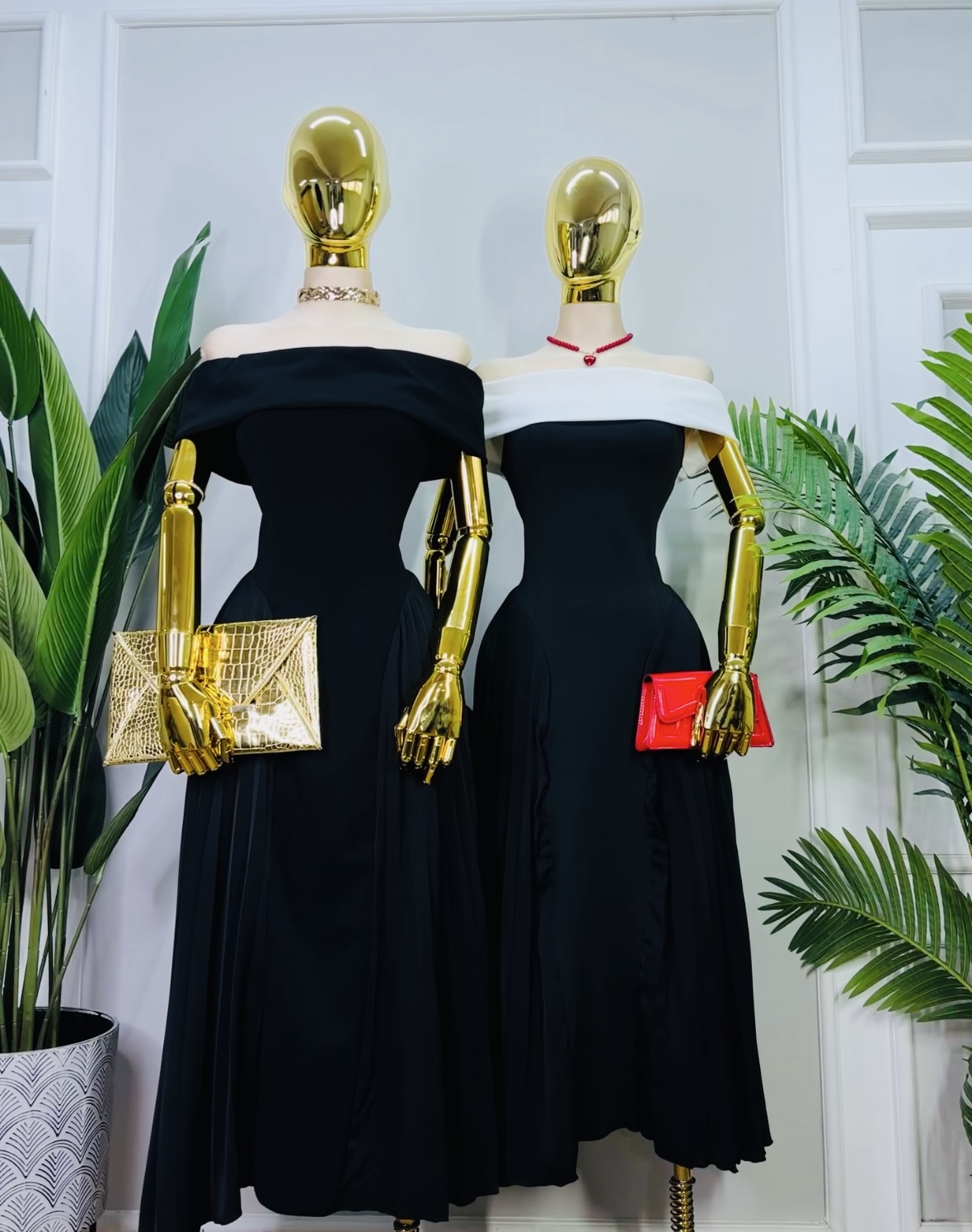 Vestido elegante midi con escote bardot que resalta los hombros y corte ajustado en la parte superior para estilizar la figura. Cierre invisible en espalda. Incluye tirantes transparentes y banda de silicón antideslizante. Falda con pliegues ligeros en costados que aportan movimiento y fluidez. Ideal para ocasiones formales o eventos de noche donde se busca un look sofisticado y atemporal.