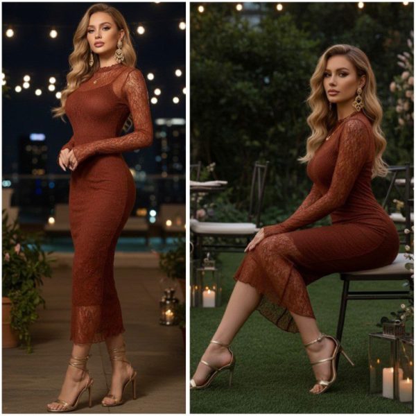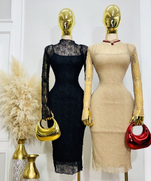 Vestido midi de dos piezas: Forro interior de tirantes delgados y ajustables, tipo slip y vestido exterior con transparencia de manga larga y cuello alto. Confeccionados en tela súper stretch que se ajusta perfecto al cuerpo. ✨