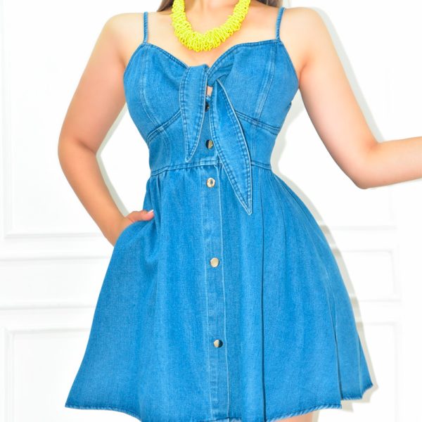 Vestido de mezclilla, escote en V con diseño de moño, Elásticos ajustables, botones frontales metálicos. Bolsillos a los costados, Elástico en espalda.