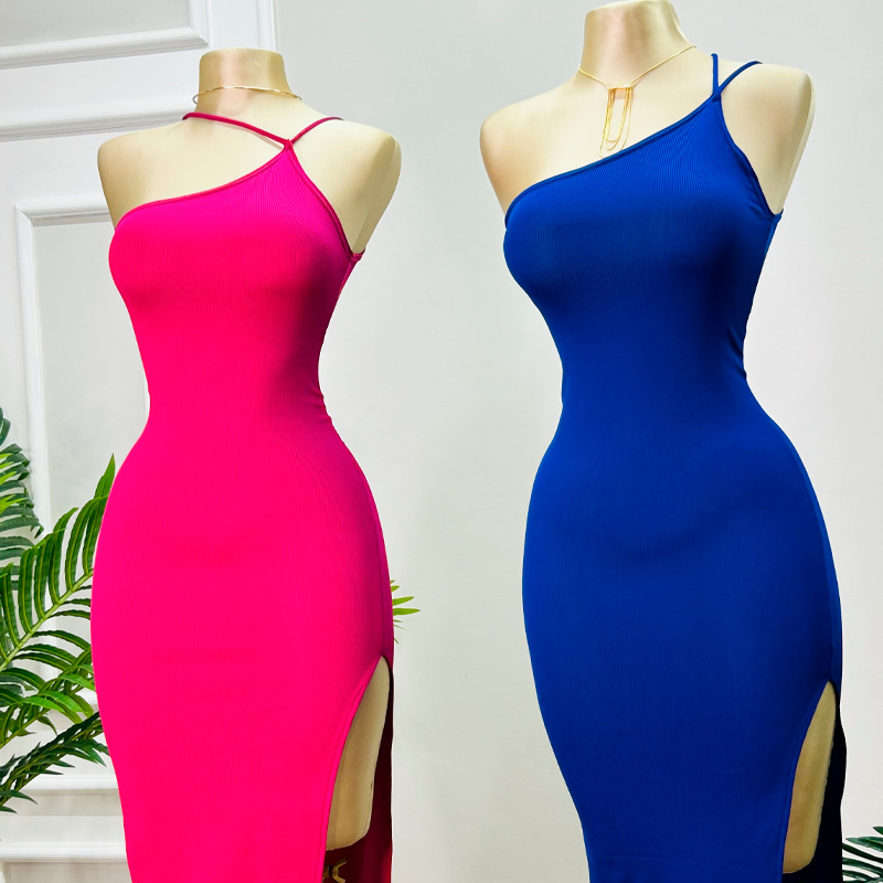 Vestido entallado de tela rib, diseño one shoulder con doble tirante. Stretch. Abertura en pierna.