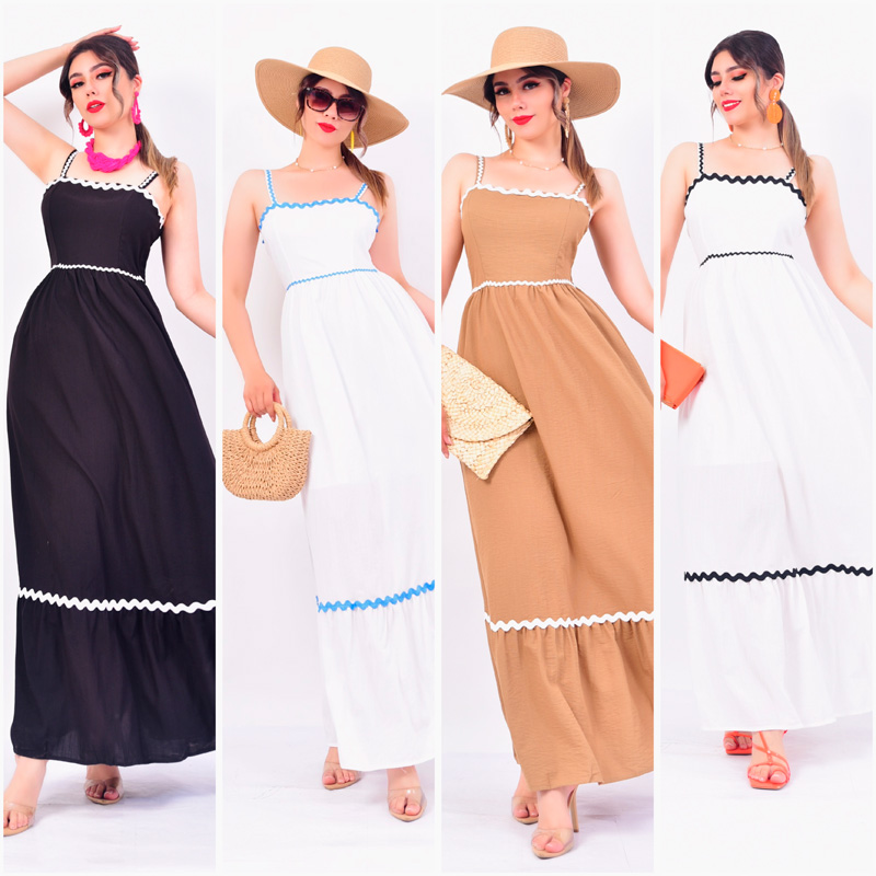 Vestido largo playero. Confeccionado en viscosa. Líneas onduladas contrastantes en escote, cintura y tirantes. Elástico fruncido en espalda.