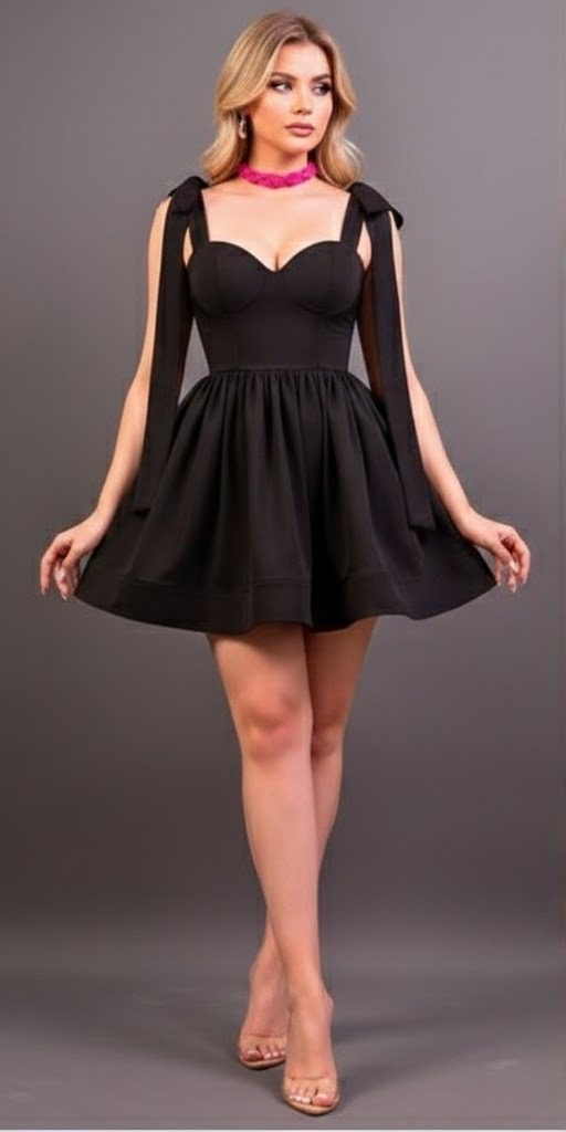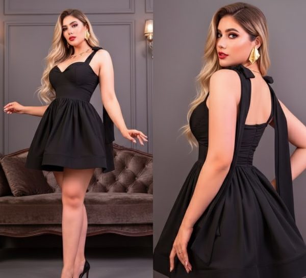 Vestido princesa con tirantes de moño y cintas extendidas. Falda con bastilla reforzada para generar volumen. Escote corazón con copas. Cierre invisible en espalda y elástico. Acabado de la tela crepé georgette.