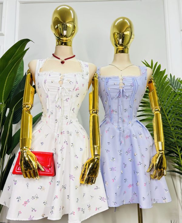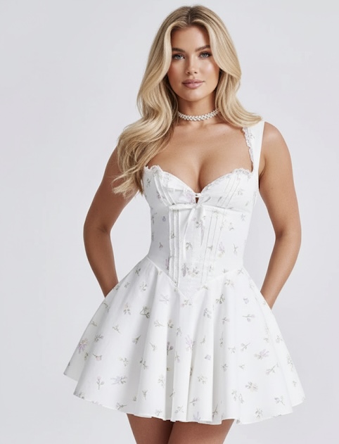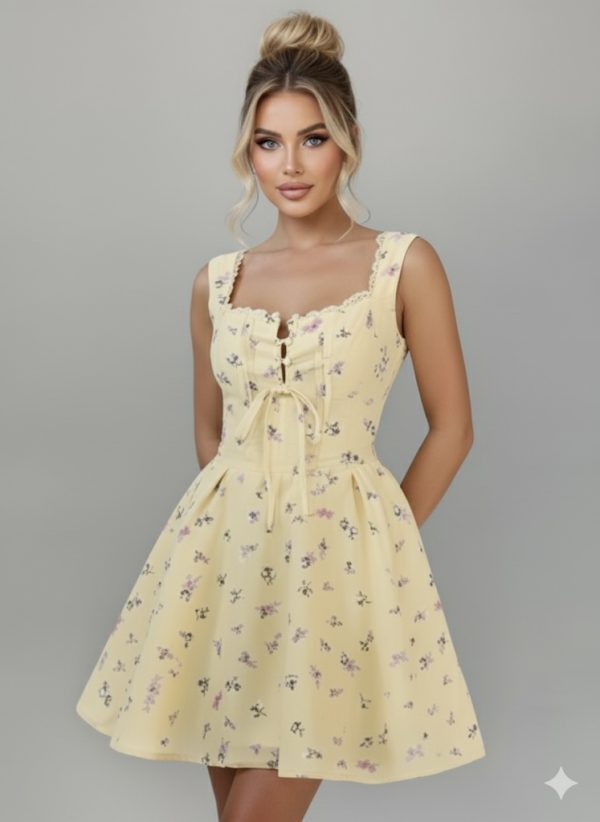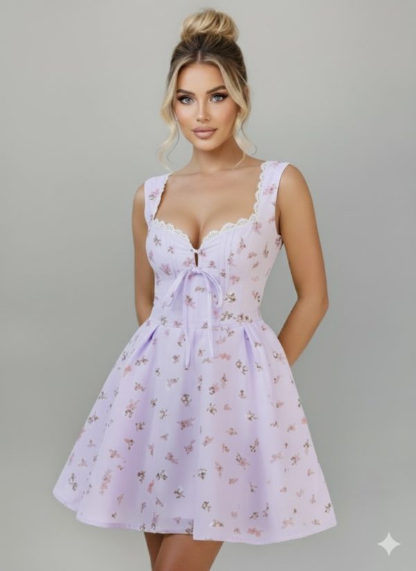 Vestido femenino corto de estilo romántico y juvenil, confeccionado en tela ligera con estampado floral. Escote recto con detalle de encaje, tirantes anchos y detalles en el frente que estilizan la figura. Cierre invisible lateral. Ajuste tipo corset en espalda. Incluye forro y tul que aporta volumen movimiento en falda. Perfecto para un look coqueto y femenino. 🎀💗