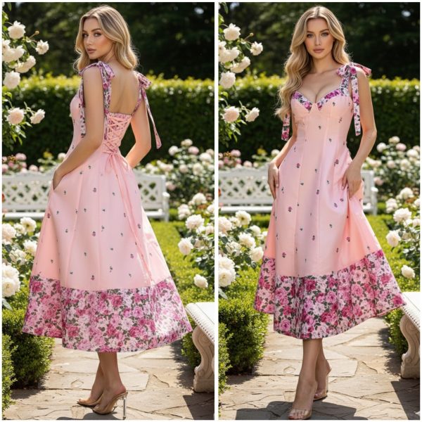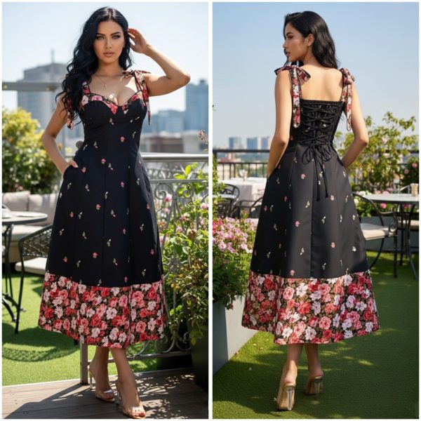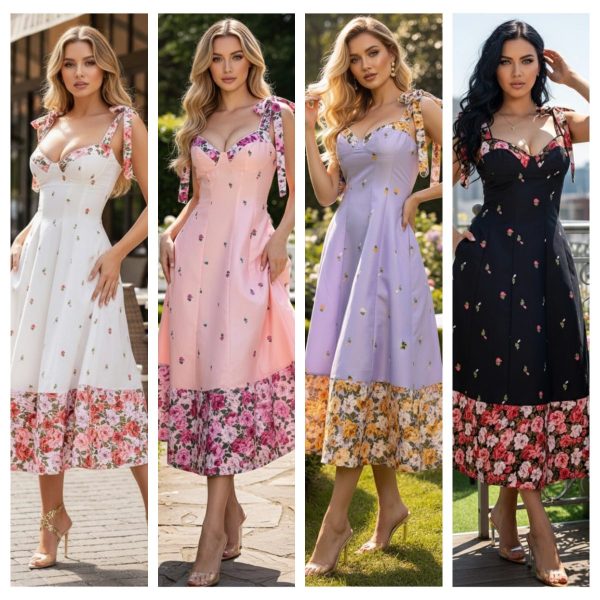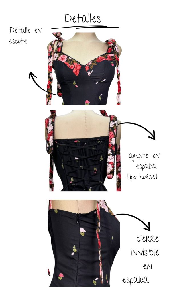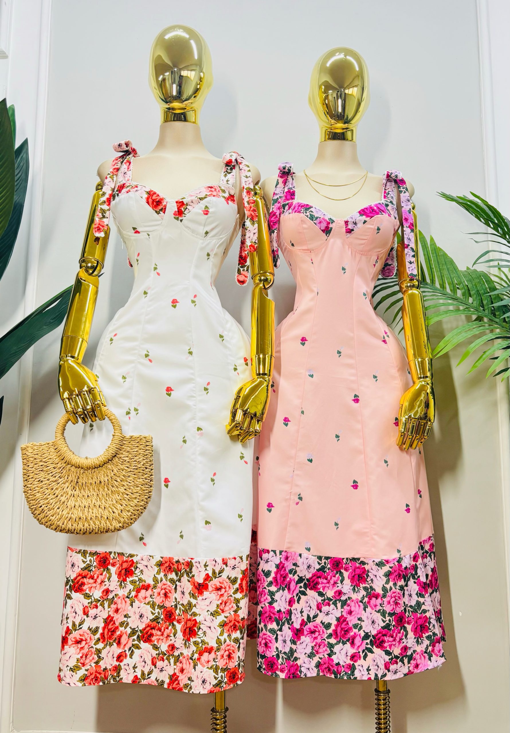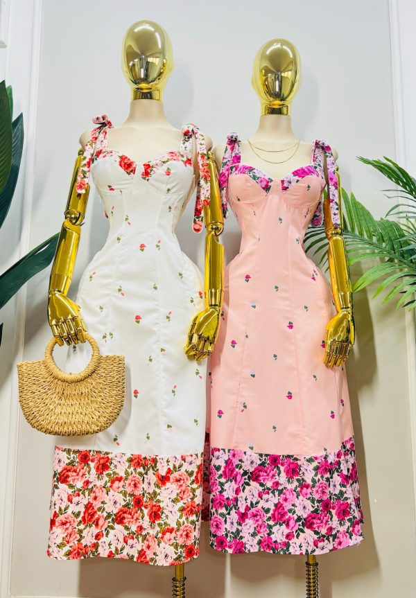 Vestido midi con estampado floral. Tirantes de lazo para amarre en hombros. Escote en forma de corazón que realza el busto. Bolsillos laterales funcionales. Ajuste tipo corset en espalda y Cierre invisible lateral para un ajuste perfecto.