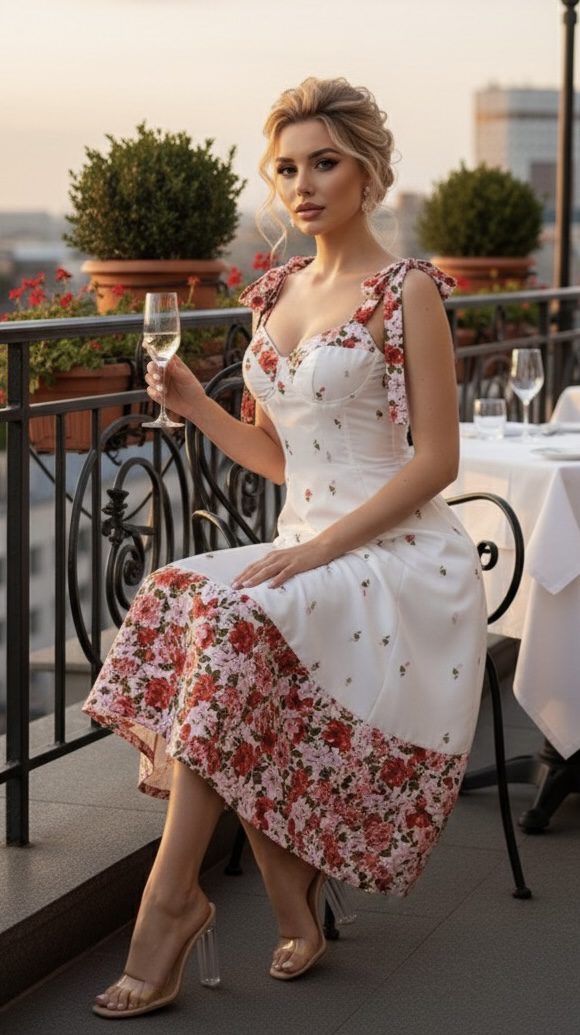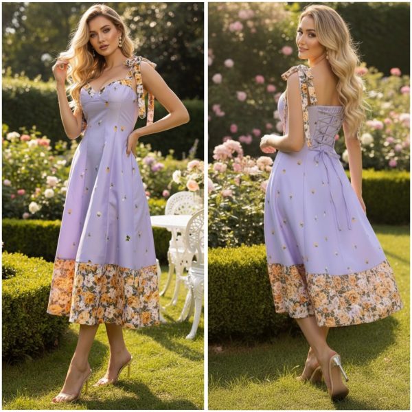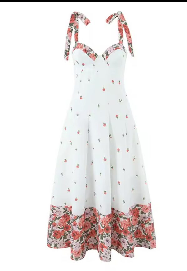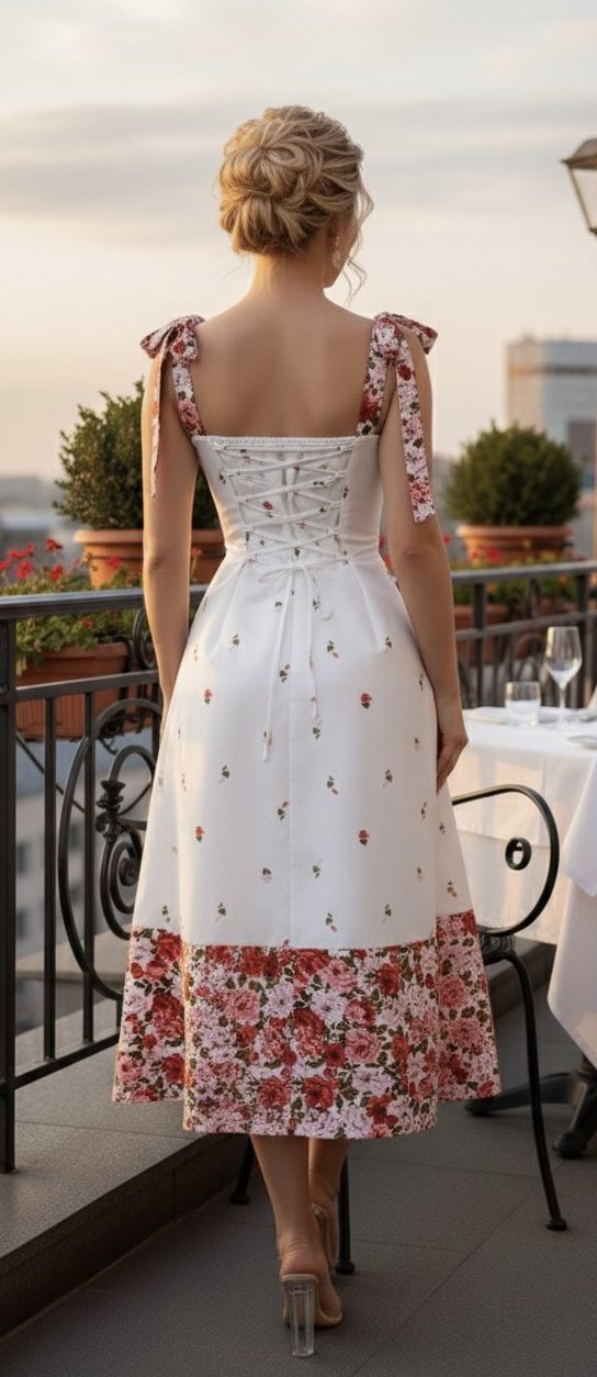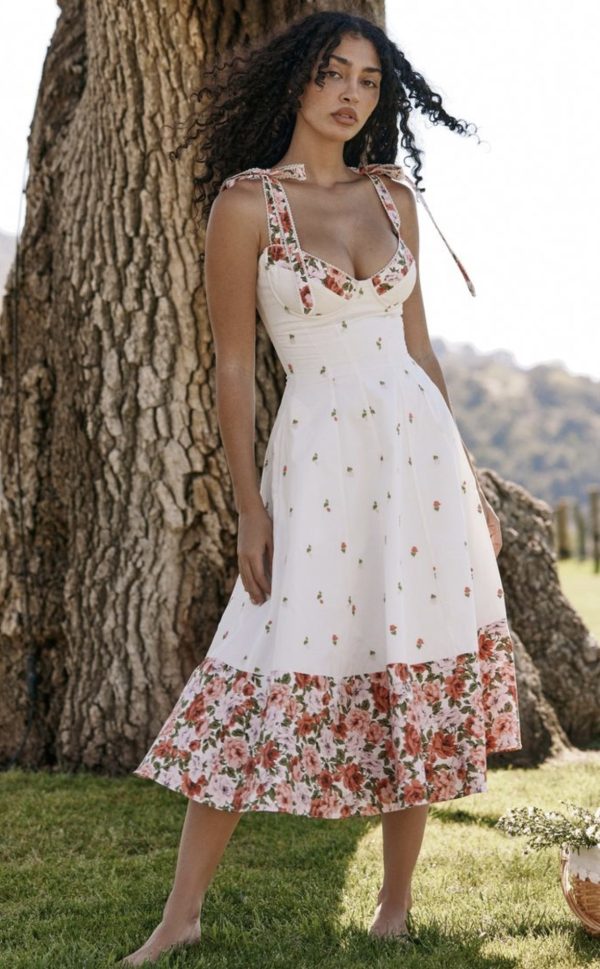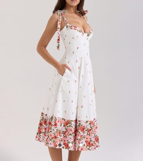 Vestido midi con estampado floral. Tirantes de lazo para amarre en hombros. Escote en forma de corazón que realza el busto. Bolsillos laterales funcionales. Ajuste tipo corset en espalda y Cierre invisible lateral para un ajuste perfecto.