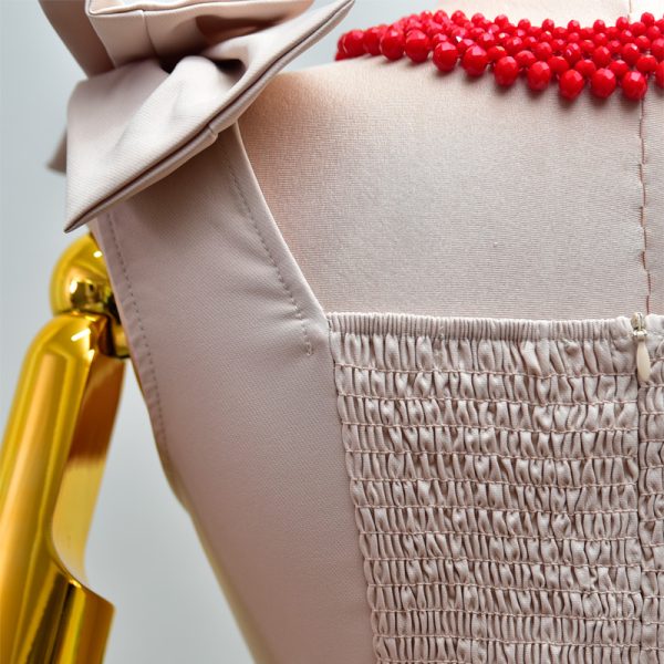 Vestido corte tubo. Detalle de moño montado aparente en tirantes. Escote cuadrado. Elástico fruncido en espalda y cierre invisible.