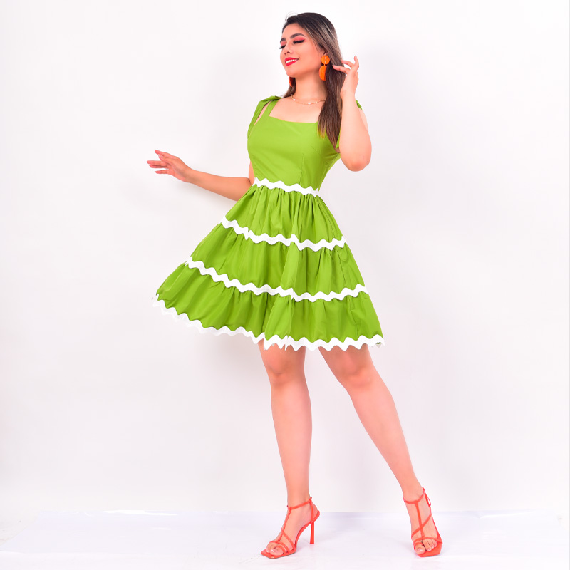 Vestido veraniedo corte línea A. Decoración con líneas onduladas. Tirantes ajustables, se pueden usar como moño. Cierre invisible en espalda.