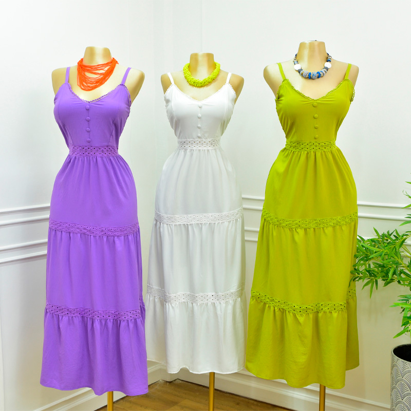 Vestido fresco con aplicaciones de crochet. Elástico corrugado en espalda. Tirantes ajustables. Botones aparentes forrados al frente. Tirantes ajustables.