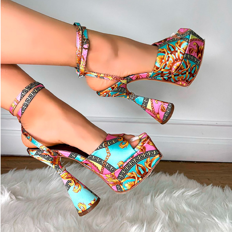 Zapatillas estampadas inspiración Versace (medusa) con detalle de anillo en plataforma.
