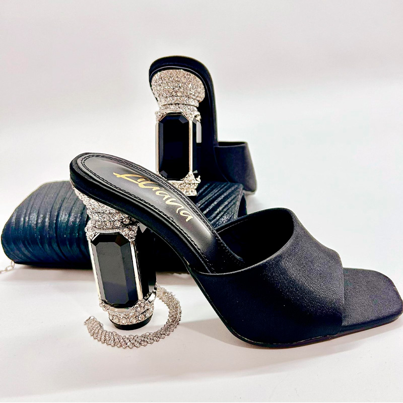 Zapatilla con tacon cubierto de pedreria. Efecto satinado. Suela antiderrapante.